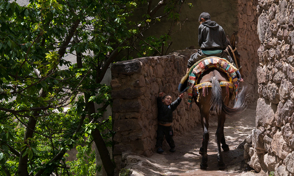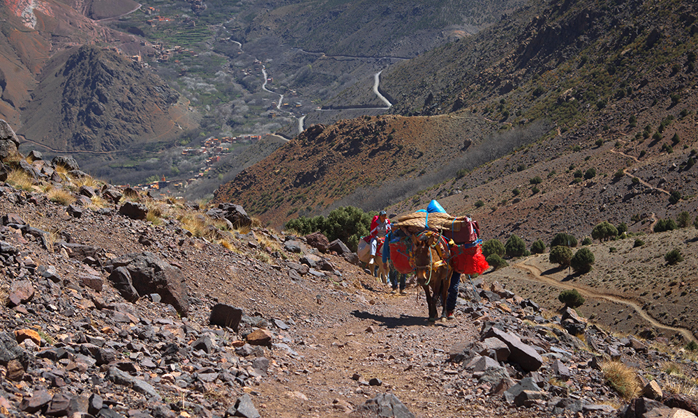 A 6 to 7 hour trek past Berber hamlets and 2 mountain passes,. The route is circular, taking in as much scenery and natural beauty as is possible. Today walk begins by heading east from Imlil (1,740m) along the Tamatert Valley before turning north through the pass Tizi n’Tamatert (2,300m) and down via the Berber village of Tinerhourhine into the Imenane Valley. This Valley is then followed to the north, along winding mule trails through almond, walnut and apple groves and terraced Berber hamlets to the villages of Ikiss and up to Amssakrou. Here a picnic lunch is normally taken, offering a superb view of the peak of Jbel Oukaïmeden (3,268m) and the 2 passes, Tizi n’Ou Arg (2,258m) and Tizi n’Tiratene (2,268m). The return is in a westerly direction via the pass, Tizi n’Aguerssiouâl, then through the Assif n’ Ait Mizane Valley and back to Imlil.