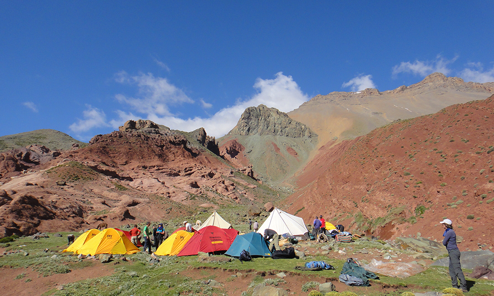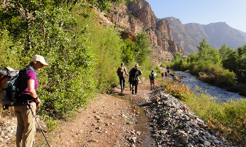 The Mgoun Massif forms the most southerly of the three ridges, which make up the High Atlas. Our trek is a high circuit in the Central Atlas and starts in the beautiful valley of the Ait Bougemez. Not only do we enjoy the majestic scenery of these rugged mountains, but also the friendly and fascinating culture of the indigenous Berbers. It is a wild area, which in comparison with the Jebel Toubkal region, sees very few groups and subsequently has a more simplistic tourist infrastructure. In many ways however the scenery is more magnificent with extensive terracing, green broad valleys pierced with irrigation canals, areas of walnut copses, strange rock formations and colours, with the villages clinging to the mountainsides. Above all this soars the peak of Mgoun at just over 4000 metres, only slightly less than Toubkal itself. All in all it is perhaps a more interesting mountain, because instead of endless scree fields, the 'Alpine start' takes you up to a high roller coaster ridge, along above and past a huge cirque (corrie) to the summit. We have watched Lammergeiers land on this high point in previous years!