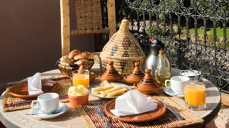 We serve cereals and homemade crepes and assorted Moroccan pastries with local jams and honey.