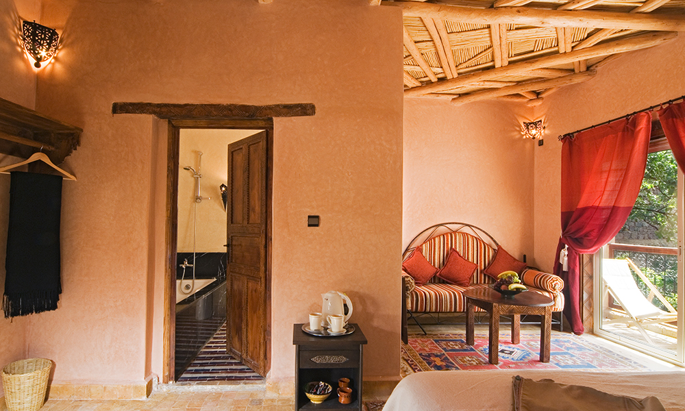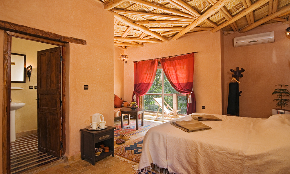 The rooms has a separate space for your clothes, a cosy Berber lounge, air conditioning and a private balcony. The bathrooms are made with traditional Moroccan Tadellakt finishing and has sink, toilet and shower